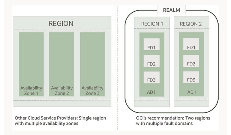 Oracle Cloud Infrastructure wird in Regionen auf der ganzen Welt gehostet, die sich jeweils in verschiedenen Städten befinden und so eine geografische Trennung ermöglichen. Die Regionen werden von unterschiedlichen Stromnetzen versorgt und in verschiedenen Netzwerkinfrastrukturen und geografischen Naturkatastrophengebieten betrieben, wie z. B. Hochwasserebenen. Um häufige Komponentenfehler zu beheben, sind alle Regionen so konzipiert, dass Hochverfügbarkeitsarchitekturen für Anwendungen und Datenbanken mithilfe von Faultdomains (FDs) unterstützt werden.