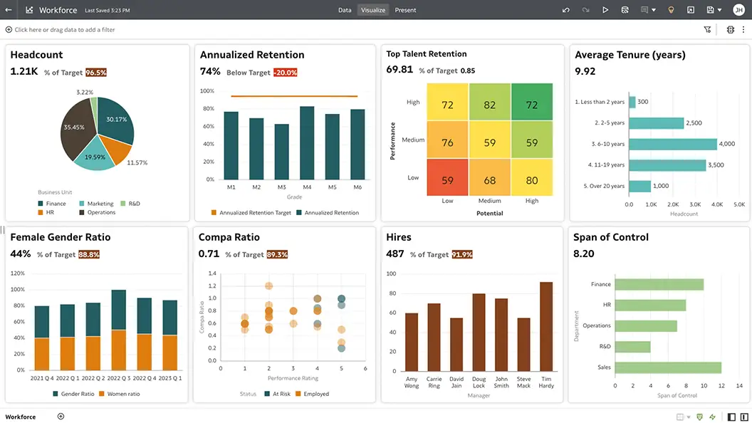 Apply a consistent framework to manage the workforce across organizations and departments. Examine and compare key metrics, such span of control, gender ratio, compa-ratio, employee retention, promotions, and average years of service. Include external data to enhance the decision-making process.