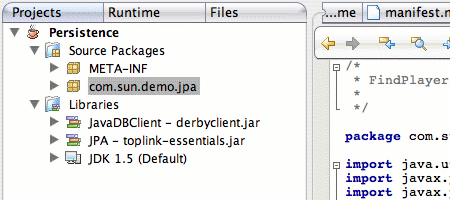 NetBeans 5.5 and later versions already have an installed version of the reference implementation, which is called Toplink Essentials. If you want updated versions of this library, however, you can use these instructions to add the library to your environment. The simplest way to accomplish both goals is to use an integrated development environment. NetBeans or Eclipse are both examples of popular IDEs that will help you include the provider implementation jar files in your compiler and JRE classpaths. The following examples use the NetBeans IDE, but you will use similar steps regardless of your IDE choice.